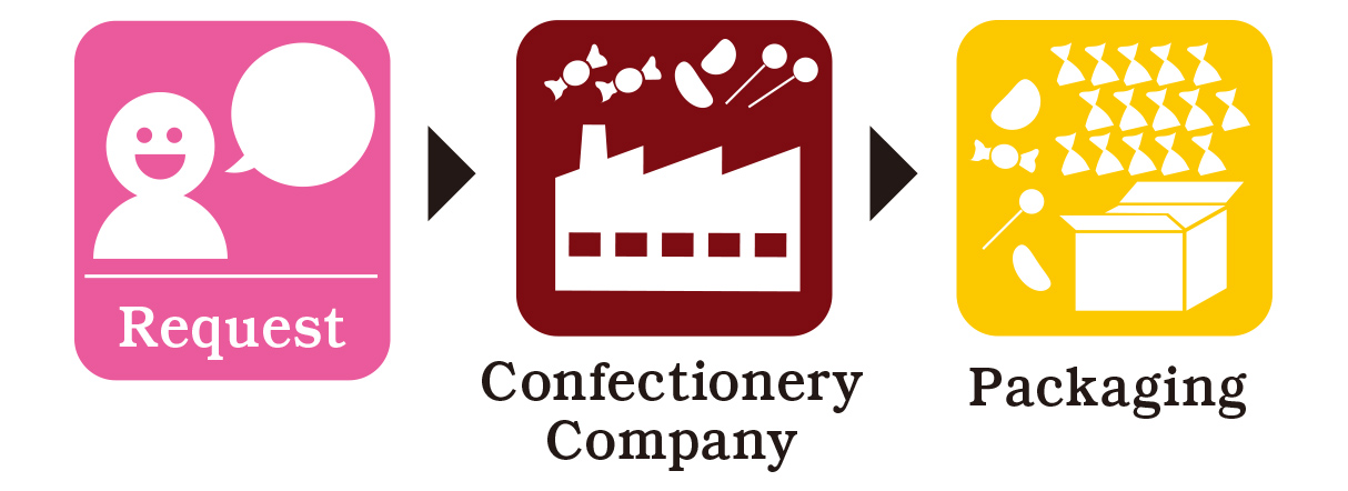 ご要望を聞き、国内外のメーカーと協力し、菓子原料素材の開発から企画・品質・生産までの一貫した具現化力でオリジナルの商品を作りだします。