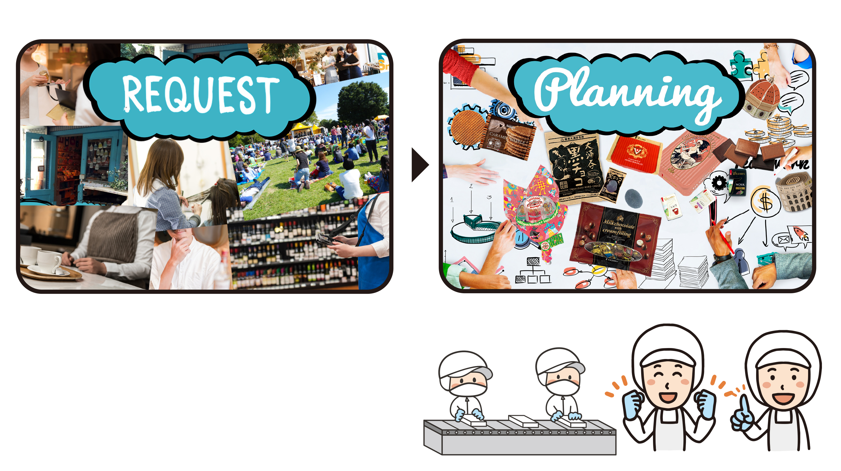 ご要望を聞き、国内外のメーカーと協力し、菓子原料素材の開発から企画・品質・生産までの一貫した具現化力でオリジナルの商品を作りだします。