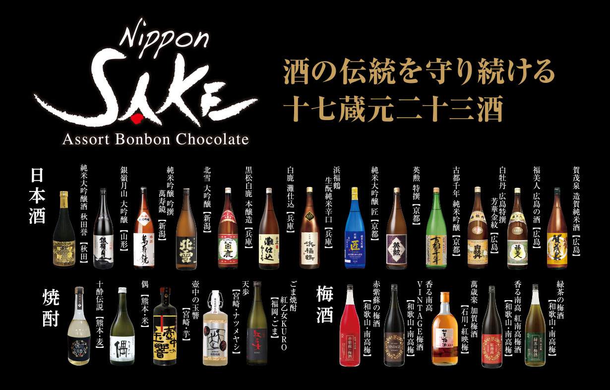 日本の酒文化と匠の技を継承する全国の蔵元より、日本酒、梅酒、焼酎を集めて、ボンボンチョコに仕上げました。酒チョコに使用しているお酒の銘柄や蔵元のこだわりをご紹介いたします。